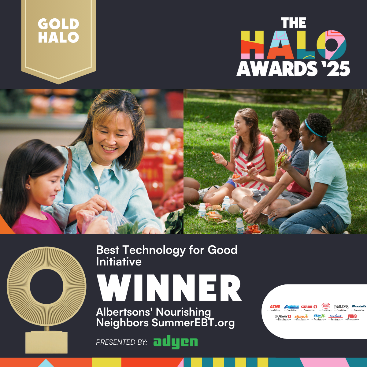 We are honored to announce that Albertsons Companies Foundation’s Nourishing Neighbors initiative has been awarded a Gold Halo Award in the Best Technology for Good Initiative for our collaboration on SummerEBT.org. Launched in June 2024, this website connects families to new summer grocery benefits, ensuring no child goes hungry when school is out. Presented by Engage for Good, these prestigious awards, selected by over 40 distinguished judges, honor individuals and campaigns redefining the social impact industry and challenging conventional best practices for corporate purposes.