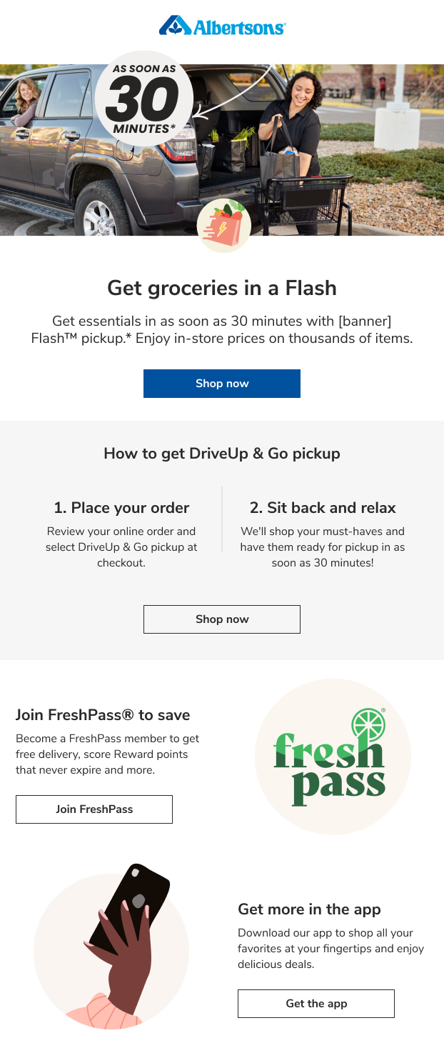 *The Service is available only in select areas and the operating hours of the Service vary by store. Please check with your local store for more details. The maximum basket size for an order placed through the Service is 35 items; provided, however that this maximum may be reduced based on your delivery location (i.e., delivery locations further from store location may be subject to reduced maximum for Service delivery option). Not all items sold by Albertsons are available to be ordered through the Service. Any displayed fulfillment time is not a guarantee and is subject to traffic and weather conditions.
