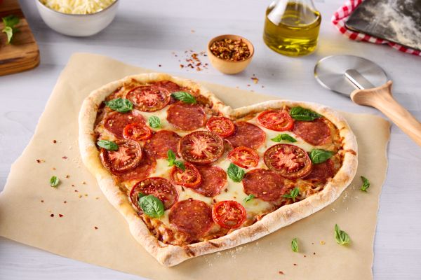 night at home, complete with wine, seafood, side dishes and maybe a heartshaped homemade pizza bundle
